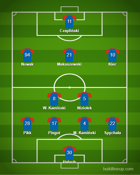 Po prawej stronie natomiast w ostatnich ligowych spotkaniach występował Michal Klec, lecz na pewno niejednokrotnie zobaczymy tam także Tomasa Mikinicia. Na pozycji napastnika postawiliśmy na Dawida Czaplińskiego, który jesienią otrzymał najwięcej minut od trenerów. Żadna „dziewiątka” Odry natomiast w tym sezonie nie imponuje liczbami. Można więc spodziewać się także obecności w składzie Bartosza Guzdka czy też Michała Bednarskiego, jeśli zdrowie mu na to pozwoli.