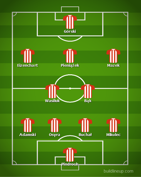 Jeżeli chodzi o trójkę bardziej ofensywną, to jedynie bardziej pewni jesteśmy gry na lewym skrzydle Bartłomieja Eizencharta, choć Resovia Rzeszów może jeszcze pozyskać kogoś na jego pozycję. Kamil Mazek w Chojniczance często grywał jako prawy pomocnik, choć sam też dobrze czuje się w środku pola. W sparingach był ustawiany i na boku, i w środku, choć my na razie zostawiamy go po prawej. Niewykluczone, że z nim o pozycję powalczy Rafał Mikulec.