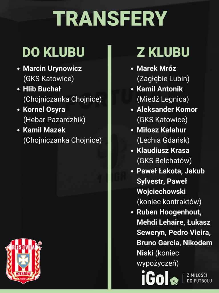 Zanim powiemy o transferach przychodzących, to najpierw musimy wspomnieć o poważnych stratach. Resovia Rzeszów straciła Marka Mroza i Kamila Antonika. Pierwszy z nich był najlepszym piłkarzem rzeszowian w zeszłym sezonie, w którym zdobył dziesięć goli i zanotował asystę. 24-letnim ofensywnym pomocnikiem zainteresowało się Zagłębie Lubin, które pozyskało go na zasadzie wolnego transferu.