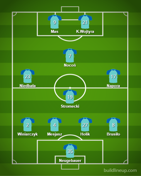 Pomoc to formacja, w której toczyć będzie się najbardziej zażarta walka o plac. Szymański, Bronisławski, Baranowicz, Muniak, Stromecki i Olejnik, który wróci raczej w trakcie drugiej części sezonu – szóstka na jedną bądź dwie pozycje w centralnej części boiska. Wzmocnienia na obu skrzydłach są potrzebne na wczoraj. Nocoń na „dziesiątce” to fundamentalna postać zespołu. Na dwóch w napadzie rasowego snajpera Wojtyrę może uzupełnić dobrze odgrywający Mas lub jego krewny Dawid.