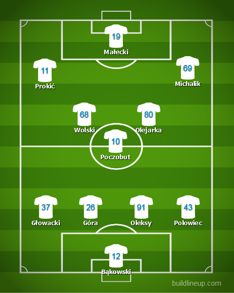 W drugiej linii na pewno będzie ustawiony Bartłomiej Poczobut, a tuż przed nim Bartosz Wolski. Najprawdopodobniej do nich zostanie dostawiony jeszcze Dawid Olejarka. Na bokach tradycyjnie Andreja Prokić oraz Damian Michalik, a na pozycji fałszywego napastnika Patryk Małecki. Trener może jeszcze trochę zamieszać z tym ustawieniem. W sparingach dużo szans otrzymywali Wiktor Kłos i Kacper Piątek. Jeżeli oni grali, to najczęściej kosztem Michalika i/lub Olejarki. Może być tak, że Myśliwiec będzie mocno nimi rotować.