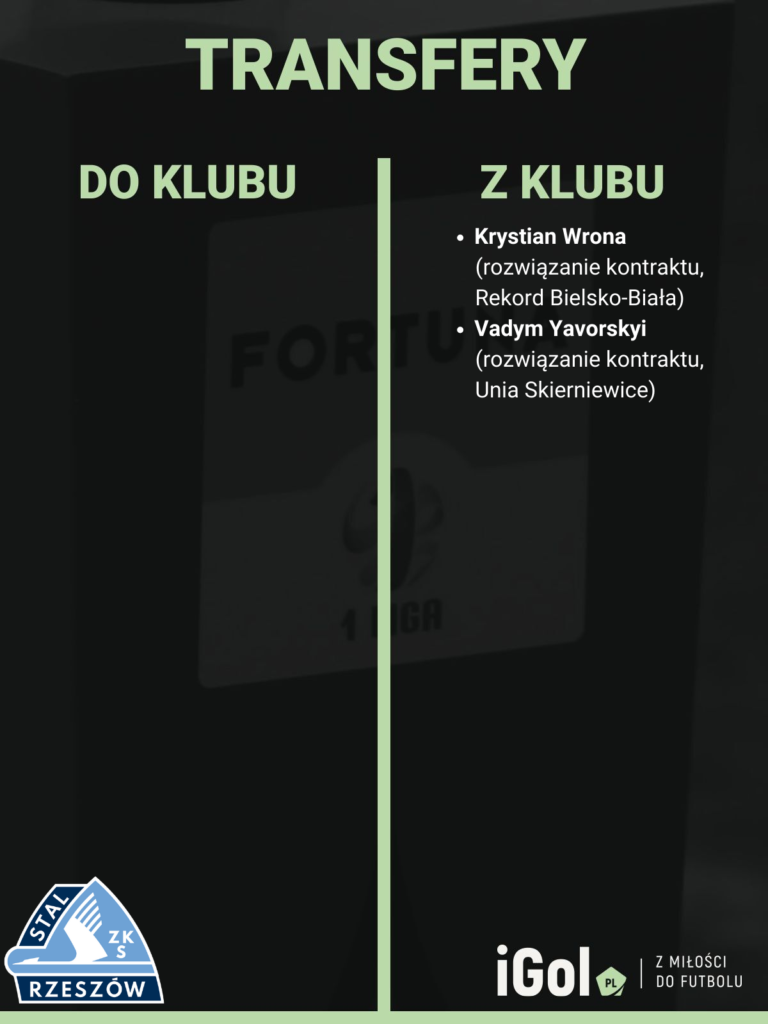 Stal Rzeszów to obok Chrobrego Głogów jedyny klub, który zimą nie został wzmocniony choćby przez jednego zawodnika. Do klubu z Dolnego Śląska jest jednak przymierzany Szymon Lewkot. Pogłoski transferowe nie łączą za to ze Stalą nikogo. Zimą włodarze podkarpackiego klubu wystawili na listę transferową piątkę zawodników: Kacpra Piątka, Kacpra Sadłochę, Manuela Ponce Garcię, Krystiana Wronę i Vadyma Yavorskyiego. Dwóch ostatnich w Rzeszowie już nie ma – obaj znaleźli angaż w trzecioligowych zespołach.