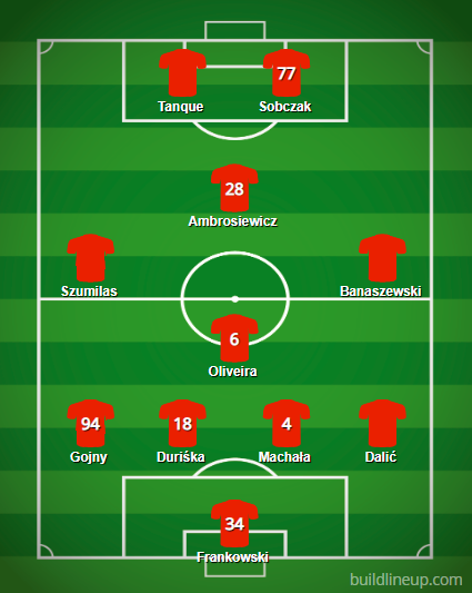 Na pozycji numer „6” Joao Oliveira, pewniak w składzie Zagłębia. Na „10” postawiliśmy Ambrosiewicza, na bokach nowe nabytki. Jest jednak bardzo możliwe, że Maksymilian Banaszewski rozpoczynać będzie mecze na lewej stronie boiska, Wojciech Szumilas wskoczy na pozycję numer „10”, a na prawej stronie zobaczymy Patryka Bryłę. Z przodu duet Sobczak – Tanque. Pierwszy sporo strzelał w sparingach przed sezonem, a drugi, jako nowy nabytek, powinien otrzymać szansę na początku tej kampanii.