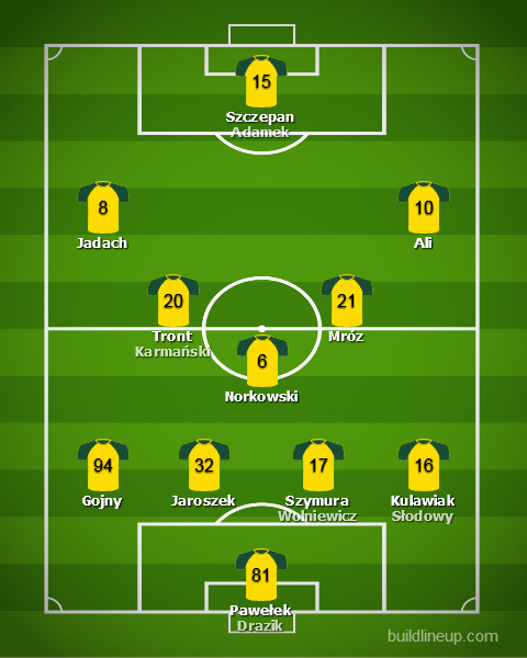 W drugiej linii raczej bez większych zmian, ale z czasem coraz więcej minut może łapać Filip Karmański, który spisywał się dobrze w sparingach. Z pewnością na boisku pojawiać się będą jeszcze Wojciech Łaski i Daniel Liszka, ale obydwaj raczej w roli zmienników. Skrzydła powinny zostać tak jak mamy na powyższym schemacie. Co do obsady ataku, to wydaje nam się, że trener w pełni postawi na Daniela Szczepana. Jeżeli będzie zawodzić, to do składu wróci Kamil Adamek.