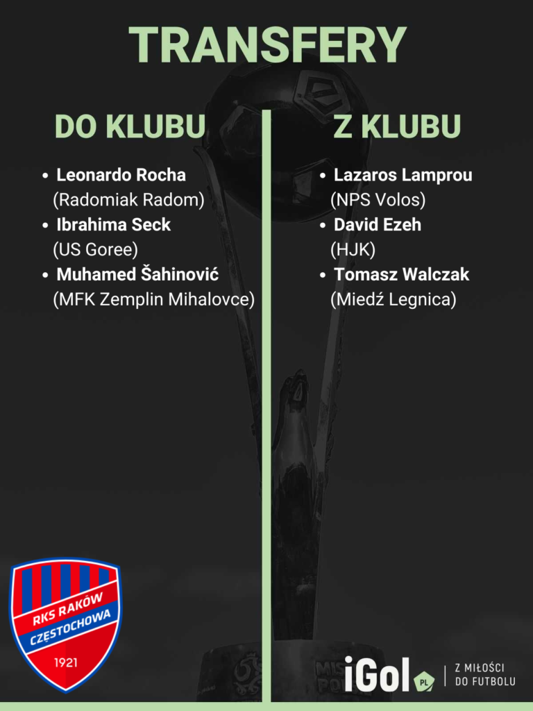 Zdecydowanie najgłośniejszym zimowym transferem Rakowa Częstochowa jest sprowadzenie Leonardo Rochy. Portugalczyk był dotychczas zawodnikiem Radomiaka, w którym bez dwóch zdań był gwiazdą. Napastnik został sprowadzony przez „Medaliki” za 700 tysięcy euro, co stanowi dziewiąty najdroższy transfer w historii Rakowa (ex aequo z Otieno). Rocha strzelił w tym sezonie PKO BP Ekstraklasy 11 bramek, co jest lepszym dorobkiem strzeleckim niż Patryka Makucha, Adriano oraz Jonatana Brunesa razem wziętych.