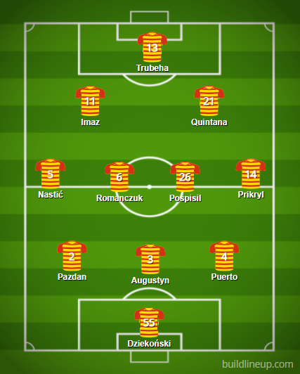 Nie jest to jeszcze optymalny skład, gdyż będą zapewne zmiany na pozycji stopera, kiedy wróci Runje, oraz napastnika, jeśli uda się zakontraktować wyższej klasy następcę Puljicia. Mimo do tej pory nie najlepszych wyników w meczach przygotowawczych trener twardo stawia na formację z trójką obrońców i takie też ustawienie przewidujemy. W kadrze większa część graczy (Wdowik, Nastić, Prikryl, Olszewski) jest bardziej dostosowana pod grę wahadłami aniżeli skrzydłami.