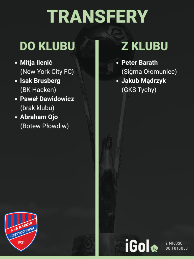 Raków nie pozbył się w tym okienku zbyt wielu swoich zawodników. Tak naprawdę z tych bardziej znaczących odszedł tylko Peter Barath, który zamienił drużynę „Medalików” na Sigmę Ołomuniec. Węgierski środkowy pomocnik trafił do Częstochowy w połowie sezonu 2023/2024. W barwach Rakowa rozegrał w sumie 64 spotkania, w których strzelił pięć bramek i zanotował dwie asysty. Klub spod Jasnej Góry sprzedał go teraz za kwotę ok. 2 milionów euro. Oprócz tego wytransferowany z Rakowa do GKS-u Tychy został Jakub Mądrzyk. 22-letni bramkarz był wychowankiem „Medalików”, których barwy reprezentował od 7. roku życia. Teraz będzie grał w pierwszoligowej drużynie prowadzonej przez Łukasza Piszczka. Częstochowianie wypożyczyli także innego swojego golkipera na rundę wiosenną. Muhamed Sahinović, który jesienią znajdował się na wypożyczeniu w słoweńskim FC Koper, następne pół roku spędzi w chorwackim HNK Gorica.