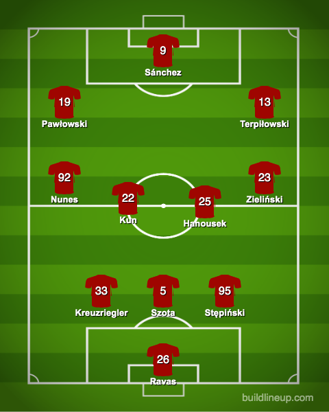 Na wahadłach bez zmian, do gry na lewej stronie po kontuzji wróci Portugalczyk Fabio Nunes, a na drugiej flance będziemy oglądać Pawła Zielińskiego. W ataku również nie spodziewamy się większych roszad. Za ofensywę „Czerwono-biało-czerwonych” powinni odpowiadać Terpiłowski, Sanchez oraz Pawłowski, który niezmiennie powinien być kluczowym piłkarzem Widzewa.