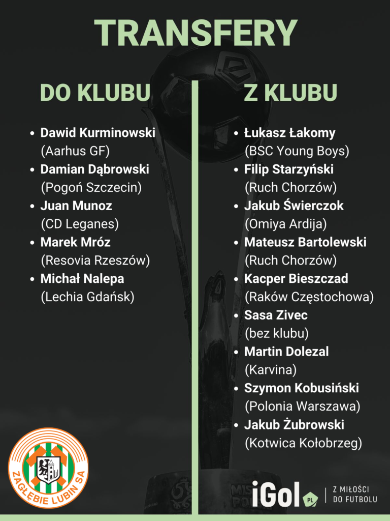 Najgłośniejszym echem rozeszło się odejście do szwajcarskiego Young Boys Łukasza Łakomego. 22-letni pomocnik na zasadzie transferu definitywnego opuścił Dolny Śląsk i podpisał pięcioletni kontrakt. Z klubem pożegnała się również niekwestionowana legenda i najlepszy w historii strzelec Zagłębia, Filip Starzyński. Jego kontrakt nie został przedłużony, mimo że obie strony prowadziły rozmowy. „Figo” zostanie jednak na ekstraklasowym podwórku, bo już podpisał umowę z Ruchem Chorzów.