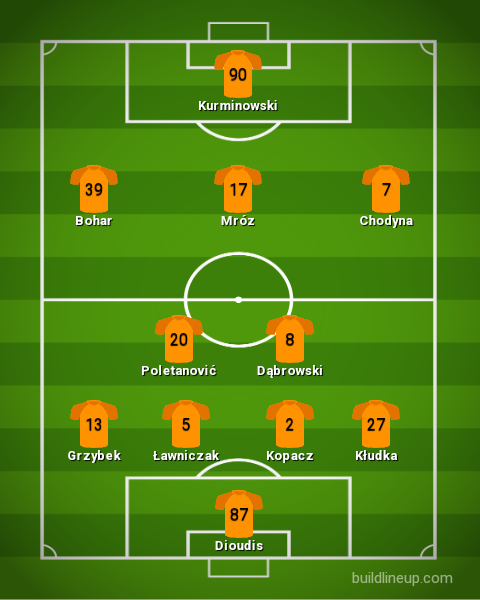 Więcej zmian możemy spodziewać się w środku pola. Tam duet powinni tworzyć Marko Poletanović i Damian Dąbrowski. Drugi z nich naturalnie zajmie miejsce po Łukaszu Łakomym. Bliżej bramki przeciwnika, za plecami napastnika, według nas zagra Marek Mróz. Na tę pozycję mogą również wskoczyć Juan Munoz i Tomasz Pieńko, lecz Hiszpan dołączył do zespołu niedawno, a Pieńko był w kadrze na młodzieżowe mistrzostwa Europy i ominął część przygotowań.