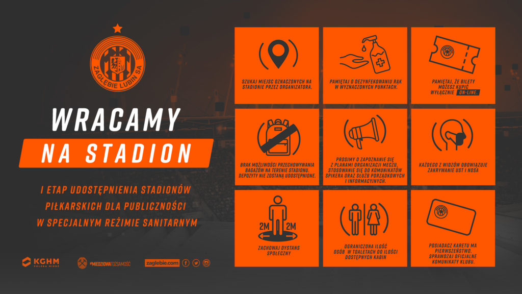 – Krzesełka, które mogą być zajęte przez kibiców, są oznaczone etykietami w miedziano-biało-zielonych barwach.* Pierwsze mecze PKO Ekstraklasy po powrocie będą sprawdzane przez organy administracyjne i PZPN i na podstawie tych obserwacji zostaną podjęte kolejne decyzje co do widowisk sportowych z udziałem publiczności. #ZAGŁKS|Szczegóły powrotu kibiców na stadion