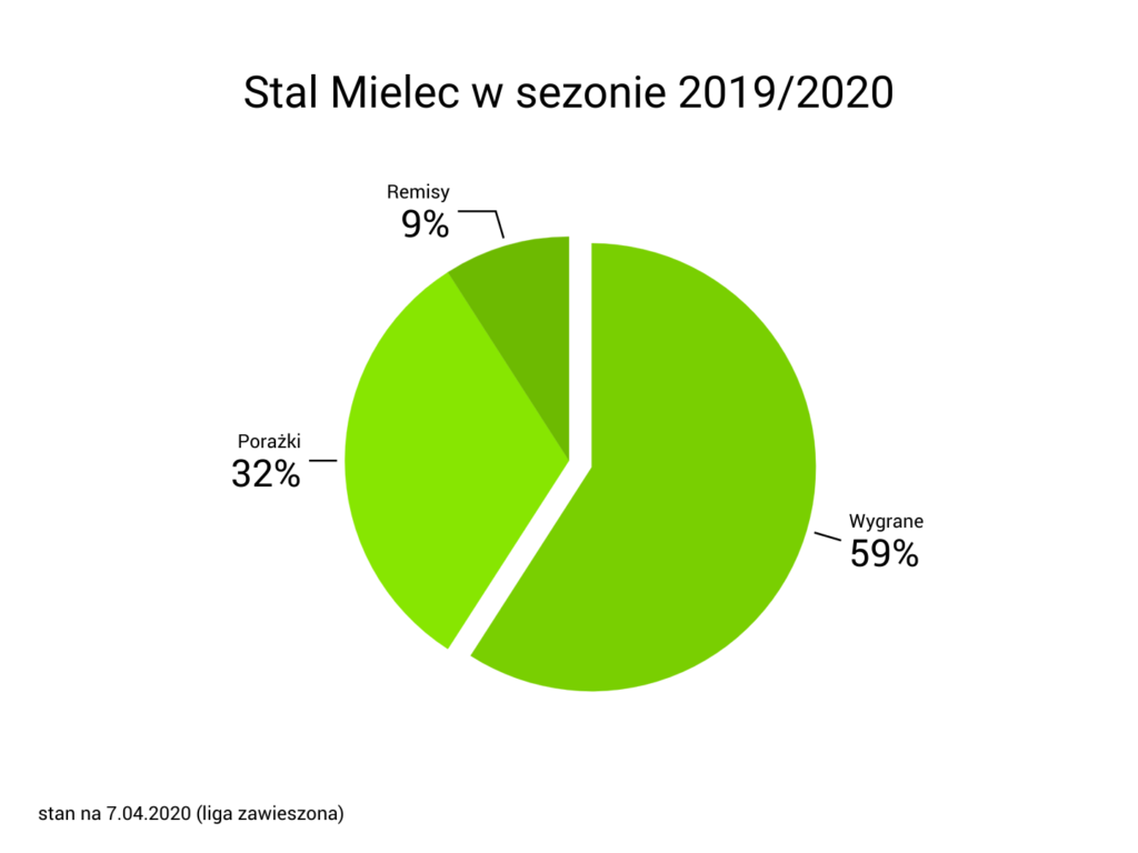Powyższy wykres kołowy pokazuje wyniki osiągane przez Stal Mielec w tym sezonie. Oczywiście te najważniejsze. Warta wspomnienia jest też seria meczów bez porażki Stali Mielec. Klub z Mielca nie poniósł porażki w okresie od 3 listopada 2019 do 8 marca 2020 roku. Seria ta zatrzymała się na sześciu spotkaniach bez porażki. Pięć z nich Stal rozstrzygnęła na własną korzyść.