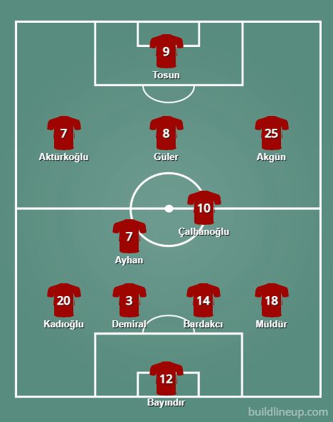 Skład został ustawiony w formacji 4-2-3-1, która jest regularnie ogrywana przez Vincenzo Montellę. W tym przypadku dwójkę zawodników w środku pola mają tworzyć Kaan Ayhan oraz Hakan Çalhanoğlu. Każdy z konkretnie przypisanymi do siebie zadaniami. Pierwszy będzie obciążony większą liczbą zadań defensywnych. Natomiast będący chodzącą legendą – mimo tylko 30 lat na karku – Hakan weźmie na siebie odpowiedzialność za kreowanie
