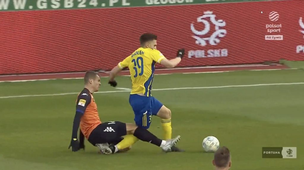 Druga kontrowersyjna sytuacja to atak od tyłu w nogi Macieja Rosołka. Jest to faul taktyczny, który ma na celu jedynie przerwanie groźnego ataku. Obrońca wykonuje go jednak na tyle nieumiejętnie, że kończy się to kontuzją i wykluczeniem z gry Rosołka do końca roku. Warto zastanowić się tutaj nad skutkiem całej sytuacji. Czy żółta kartka to wystarczająca kara dla obrońcy?