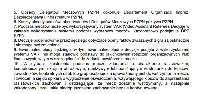 Uwagę przykuwa artykuł 3. punkt 7. – Podczas meczów może być wykorzystywany system VAR (Video Assistant Referee). Decyzje w zakresie wykorzystania systemu podczas wybranych meczów, każdorazowo podejmuje DPP PZPN. Oznacza to, że system VAR na zapleczu wcale nie funkcjonuje tak jak w najwyższej klasie rozgrywkowej, w której jest on obecny na każdym meczu. Aby technologia stała się jak najbardziej dostępna dla wszystkich klubów, zdecydowano się na wprowadzenie tzw. VAR light.