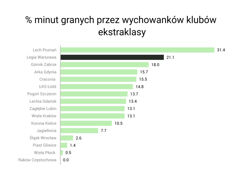 Wychowankowie w Legii rozgrywają 21,1% wszystkich dostępnych minut. Jest to wynik bardzo dobry, choć wyraźnie lepszy w Polsce jest poznański Lech, w którym wskaźnik ten sięga aż 31,4%. Ogromną wartością dodaną będzie otwarcie Legia Training Center, które powstaje nieopodal Warszawy. Dysponując taką bazą zarówno klub, jak i jego akademia będzie mogła wskoczyć na jeszcze wyższy szczebel. Więcej o nowoczesnym ośrodku tutaj.