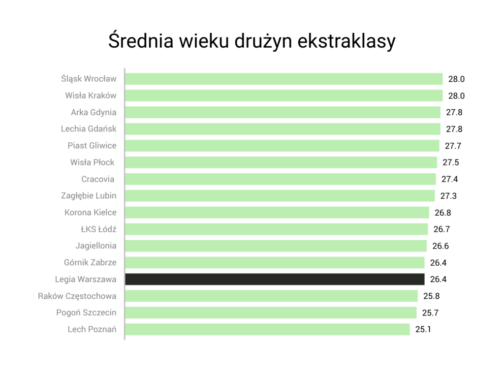 Skupmy się teraz na średnim wieku zespołu, który przy Łazienkowskiej wynosi 26,4 lat. W polskiej najwyższej lidze młodsze są tylko Raków Częstochowa, Pogoń Szczecin i Lech Poznań. W kadrze znajduje się aż ośmiu młodzieżowców: Majecki, Miszta, Muzyk, Karbownik, Praszelik, Pyrdoł, Rosołek i Kostorz. Najmłodszy jest urodzony 30 października 2000 roku rezerwowy bramkarz Cezary Miszta, ale niewiele starszy Michał Karbownik zwrócił już na siebie uwagę twórców piłkarskiej opinii, prezentując w lidze fantastyczne umiejętności.