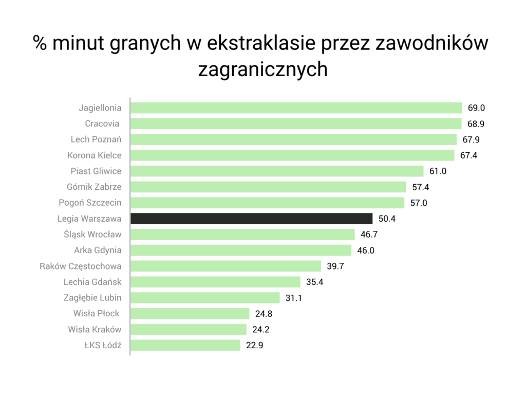 Oglądając poczynania Legii, zwracać uwagę może to, że gracze legitymujący się innym niż polskie obywatelstwem prezentują odpowiedni (całkiem dobry) kunszt i – jeżeli spojrzymy na LOTTO Ekstraklasę – poniżej pewnego levelu (przyzwoitego) nie schodzą (oczywiście nie umniejszamy innym zespołom, są piłkarze jakościowi, wybijający się ponad przeciętność: Basha, Żukov, Badia i kilku innych, ale nie o tym teraz). Co również bardzo ważne, obcokrajowcy występujący w barwach klubu z Łazienkowskiej rozgrywają około 50% czasu gry, a drugie tyle dostają Polacy. Z takim bilansem warszawska drużyna plasuje się dokładnie w środku stawki, w której zdecydowanym liderem jest Jagiellonia – zagraniczny zaciąg gra tam w 69% wszystkich dostępnych minut.