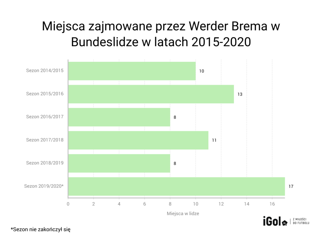 Zeszły sezon „Zielono-biali” skończyli na 8. miejscu, co można uznać za dobry rezultat, porównując tę lokatę do lat poprzednich. W latach 2000–2010 Werder był czołową niemiecką drużyną, lecz kolejne dziesięć lat było już znacznie mniej udane. Chociaż Werder gra w 1. Bundeslidze aż od sezonu 1980/1981, to przykład HSV Hamburg, który spadł z najwyższej ligi w 2018 roku pierwszy raz w historii, pokazuje, że każda seria kiedyś się kończy.