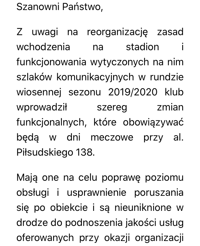 Na sześć dni przed spotkaniem Widzewa z Olimpią Elbląg, które inaugurowało rundę wiosenną, ludzie, którzy wykupili miejsca na sektory A5 i A8, otrzymali wiadomość na swoje skrzynki mailowe.
