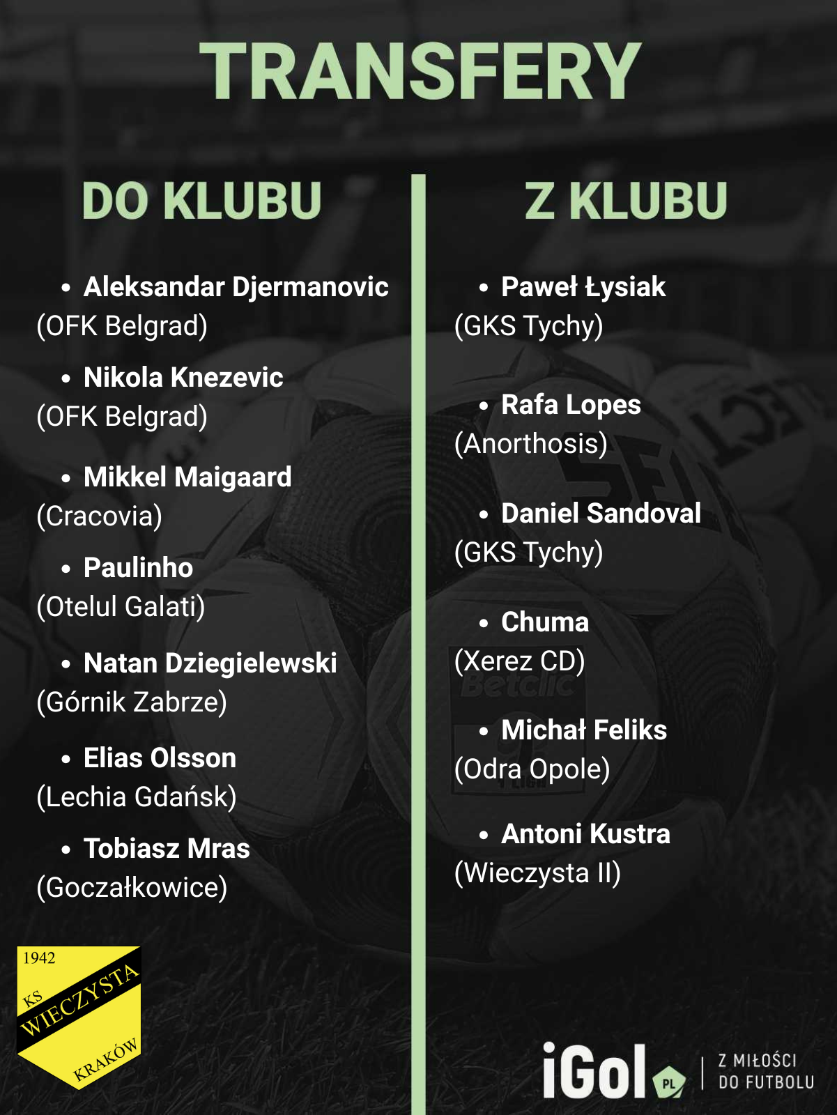 Jeśli ktoś myślał, że Wojciech Kwiecień po awansie do 1. ligi zwolni tempo inwestycji, zimowe okienko transferowe wyprowadziło go z tego błędu. Wieczysta Kraków wydała w tym oknie transferowym astronomiczne, jak na polskie warunki kwoty. Budzą one zazdrość nawet w klubach z PKO Ekstraklasy, nie mówiąc już o rywalu zza płotu, Wiśle Kraków. Najgłośniejszym ruchem był transfer Aleksandara Dermanovicia z OFK Beograd. To absolutny rekord transferowy ligi, który ma przynieść jeden efekt: koniec problemów z traceniem bramek po stałych fragmentach gry. Đermanović to „wieża”, która ma rządzić w powietrzu. Wspierać go będzie Elias Olsson, wypożyczony z Lechii Gdańsk. Duet ten ma stworzyć ścianę nie do przebicia.