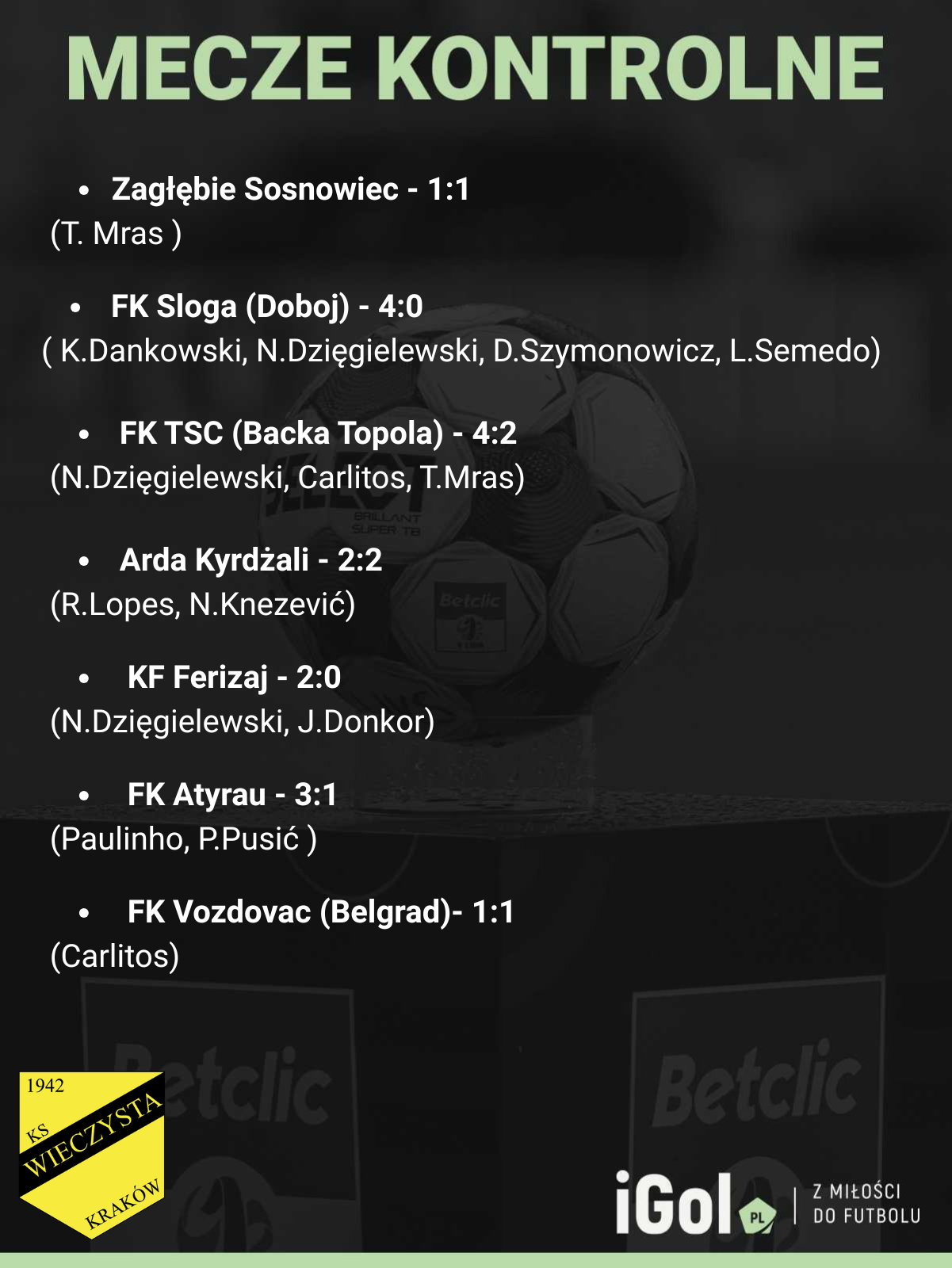 Najbardziej spektakularnym momentem zgrupowania było zwycięstwo 4:2 nad serbskim TSC Backa Topola. Pokonanie solidnej, europejskiej marki z Serbii to sygnał, że potencjał kadrowy Wieczystej wykracza poza ramy polskiej pierwszej ligi. W tym meczu widać było wszystko, czego oczekuje trener. Szybkie przejście z obrony do ataku i mordercza skuteczność. Wcześniejsze zwycięstwo 4:0 nad Slogą Doboj było z kolei popisem siły rezerwowych i dowodem na to, że kadra jest niesamowicie szeroka. Wygrana 2:0 z KF Ferizaj oraz cenny, wywalczony w trudnych warunkach remis 1:1 z FK Vozdovac na zakończenie obozu dopełniają obrazu drużyny, która nauczyła się kontrolować tempo meczu. Sparingi te pokazały przede wszystkim, że nowa para stoperów zaczyna się rozumieć bez słów, a kreatywność w środku pola wzrosła o kilka poziomów.