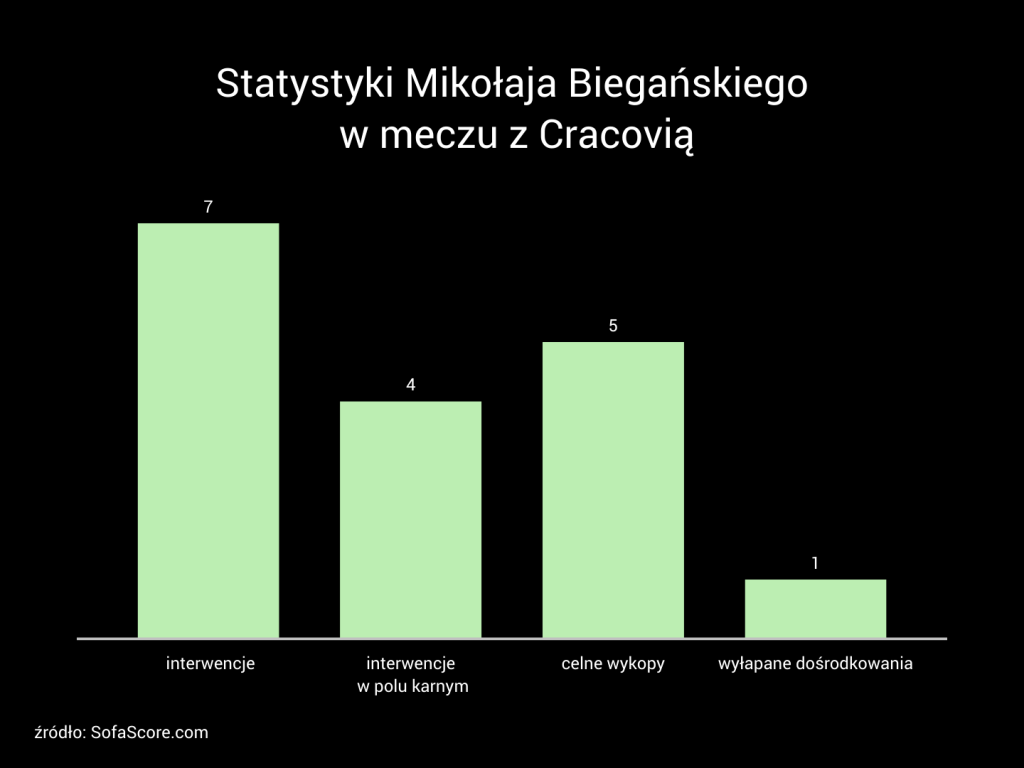 Młody bramkarz ponownie zaliczył świetny występ. To może cieszyć każdego kibica „Białej Gwiazdy”. Tym razem pokazał pełnię swoich umiejętności w tak istotnym spotkaniu, w którym, jak powszechnie wiadomo, ciśnienie sięga zenitu. Mimo to nie zawiódł, a wręcz przekroczył oczekiwania fanów. Na poniższej grafice możemy zauważyć statystyki Biegańskiego przeciwko Cracovii.