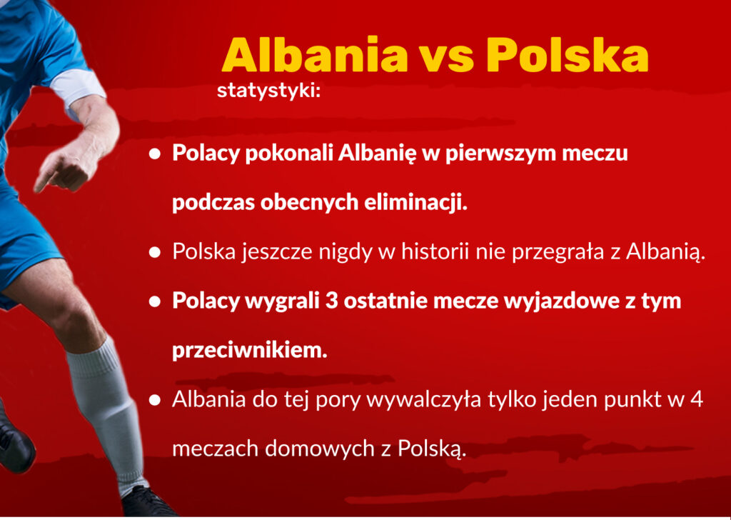 Biało-czerwoni z pewnością zdają sobie sprawę, jak trudnym zadaniem będzie pokonanie tego przeciwnika w meczu wyjazdowym. Ogólnie jednak statystyki z meczów bezpośrednich przemawiają na korzyść naszego zespołu. Polska zwyciężyła w 3 ostatnich meczach wyjazdowych, z tym przeciwnikiem, a łącznie podczas delegacji do Albanii zanotowała tylko jeden remis. Statystykom nie można jednak do końca ufać, o czym przekonała się nasza kadra podczas ostatniego zgrupowania i meczu wyjazdowego z Mołdawią.