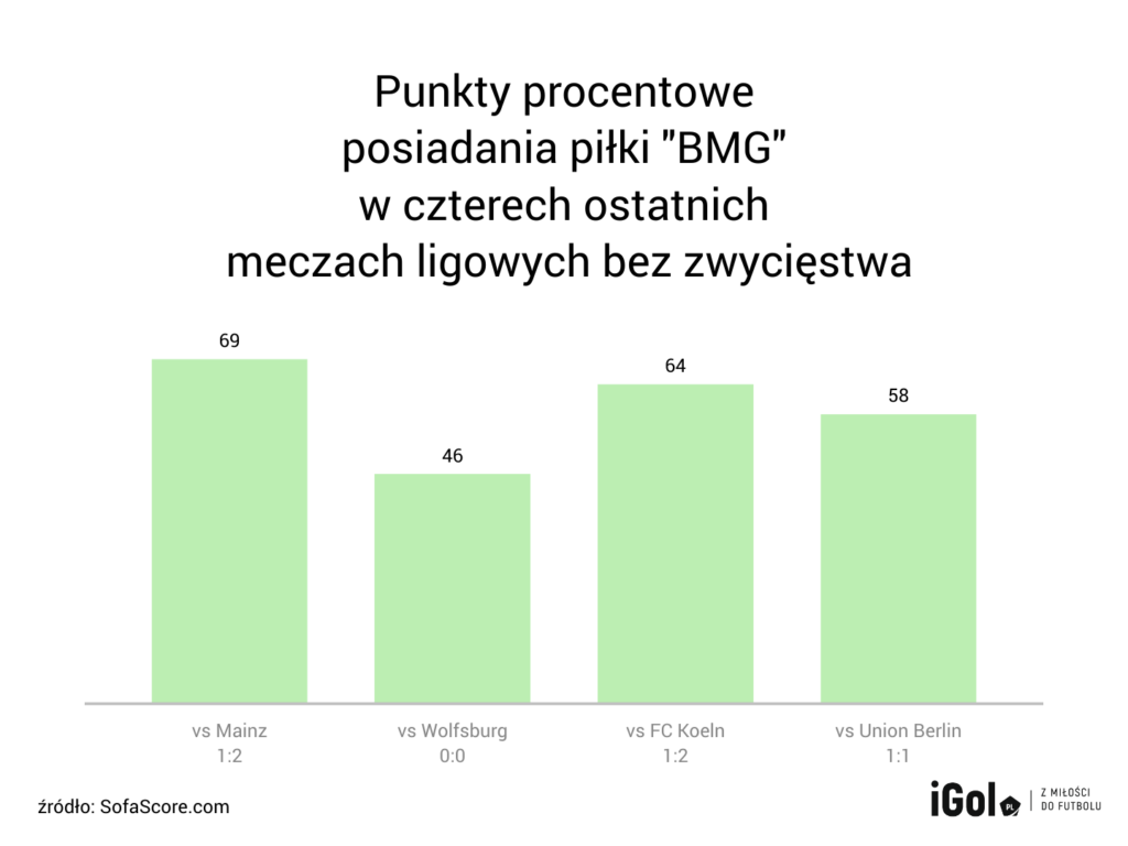 O tym, że utrzymywanie się przy futbolówce nie jest w meczu najważniejsze, mówi wiele przykładów. W tym właśnie niektóre Mönchengladbach w tym sezonie. Zespół pomimo faktu, że przeważał w części przegranych spotkań, to nie potrafił udowodnić tego pod bramką rywala. Widać to było nie tylko w ostatnich meczach, lecz także i przy grudniowej zadyszce. W kluczowym momencie brakuje mu zimnej krwi i to jest z pewnością jeden z głównych powodów słabszej formy.
