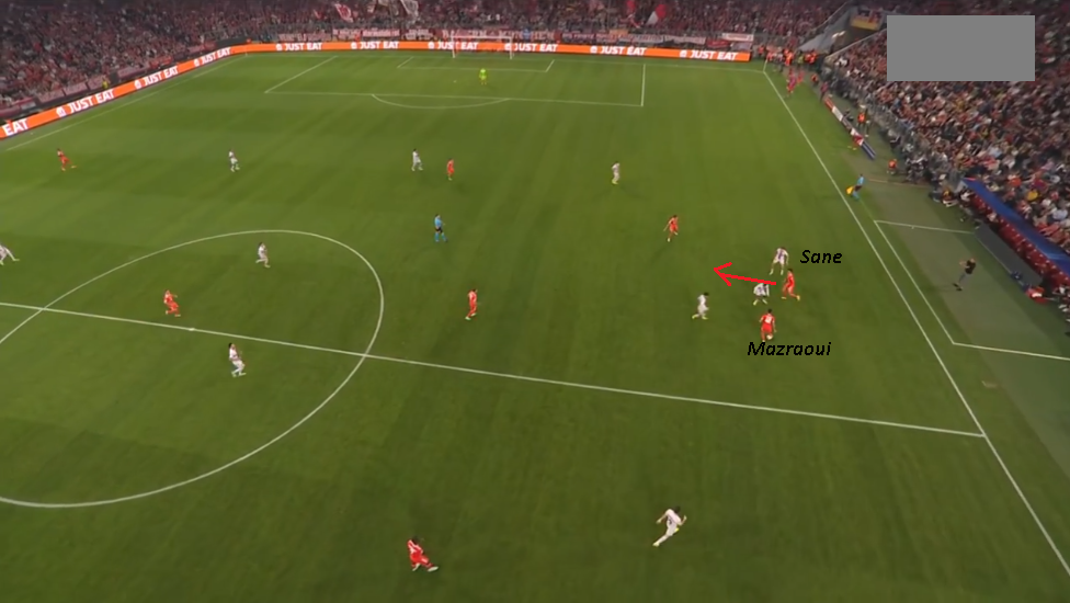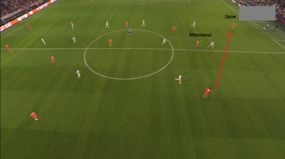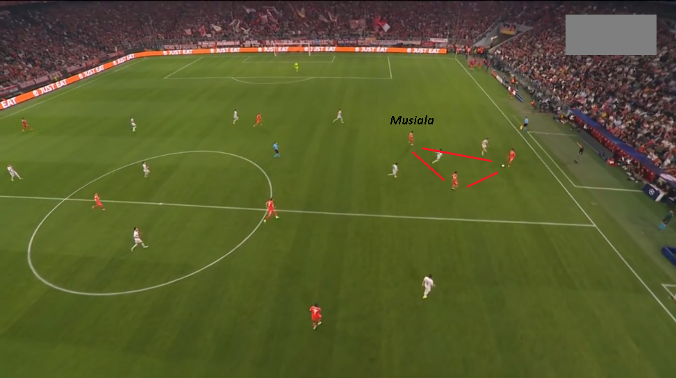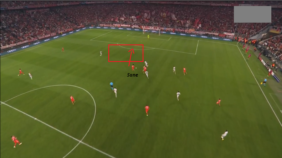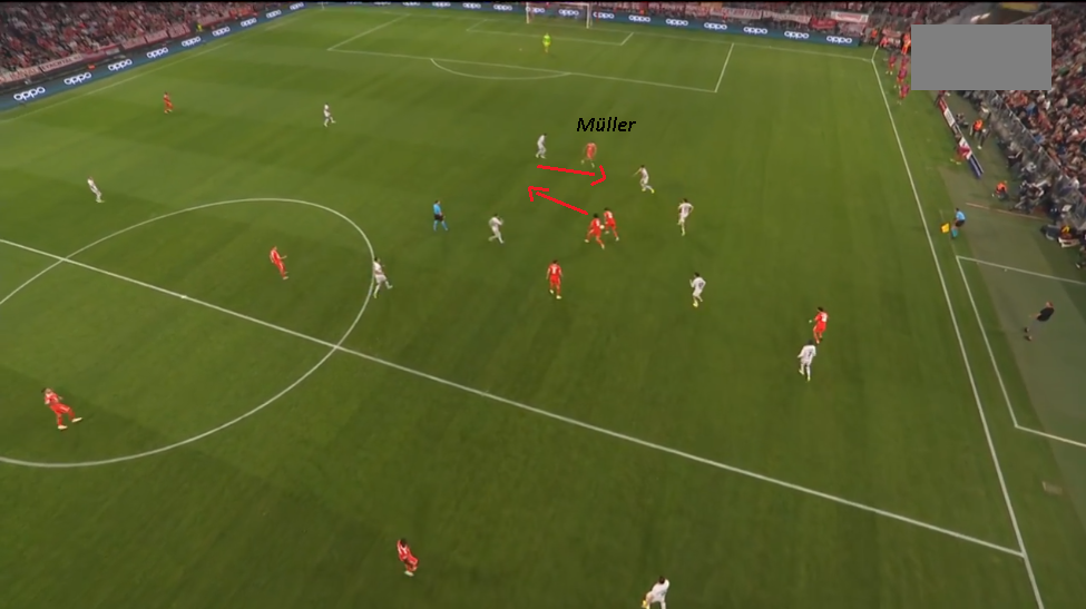 W jaki sposób gospodarze szukali sposobu na ominięcie wysokiego pressingu przeciwnika? Głównymi pomysłami były wysokie podania na skrzydłowych lub napastników. Było to też dość niespotykane jak na Bayern rozwiązanie, zważając na fakt, iż jego ofensywni zawodnicy wcale nie są mistrzami gry w powietrzu. Jednak wynikało z konieczności, bo ominięcie pressingu po ziemi było w tamtym momencie meczu i dyspozycji pomocników wręcz awykonalne.